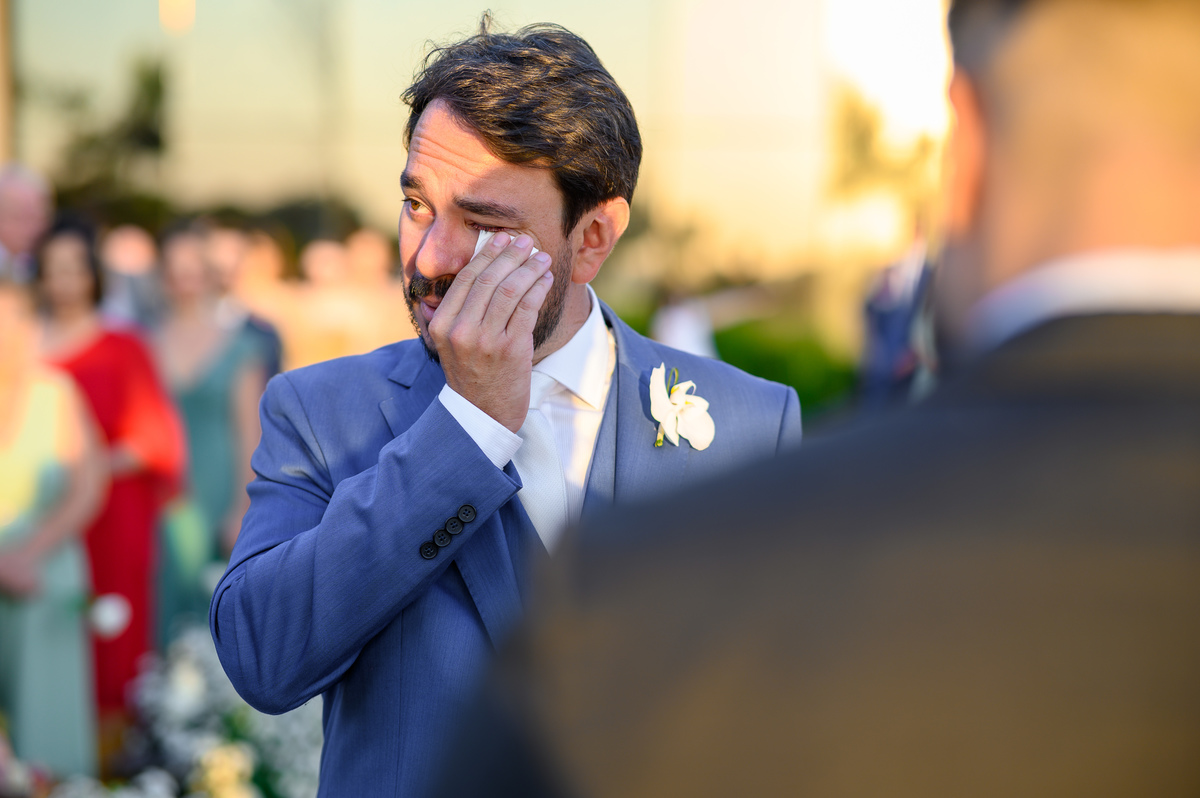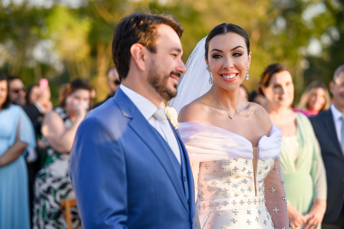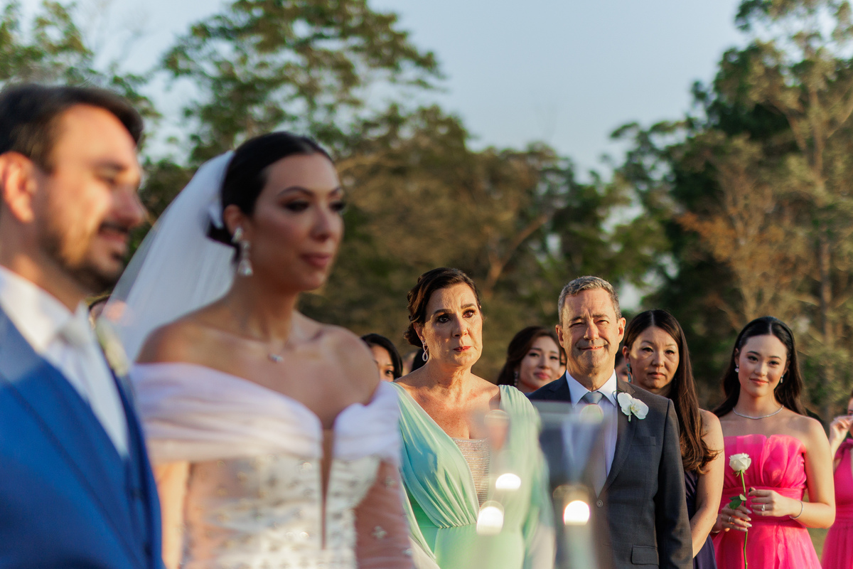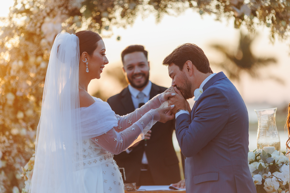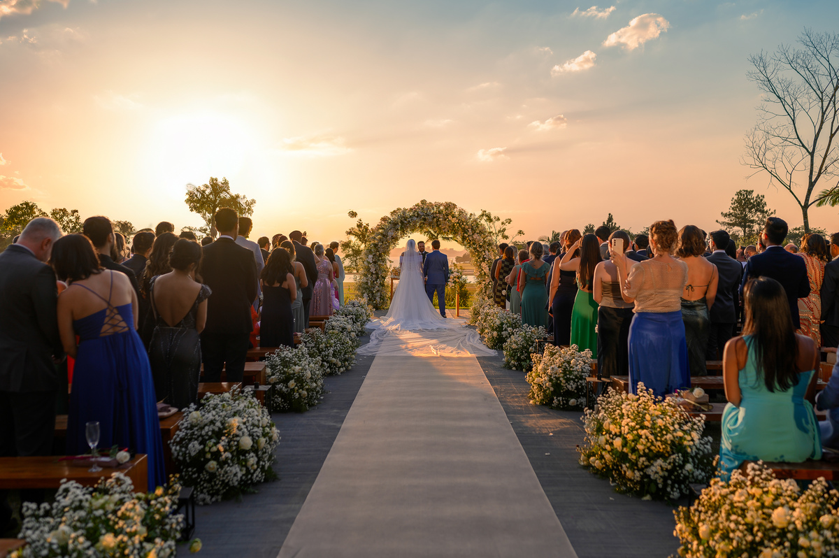 Entre lágrimas contidas e sorrisos que diziam mais do que qualquer palavra, cada olhar trocado parecia reafirmar a certeza de que estavam exatamente onde deveriam estar. A cerimônia ao pôr do sol trouxe uma luz quente e acolhedora, envolvendo o casal e todos que estavam ali para testemunhar essa união. Era impossível não se emocionar.